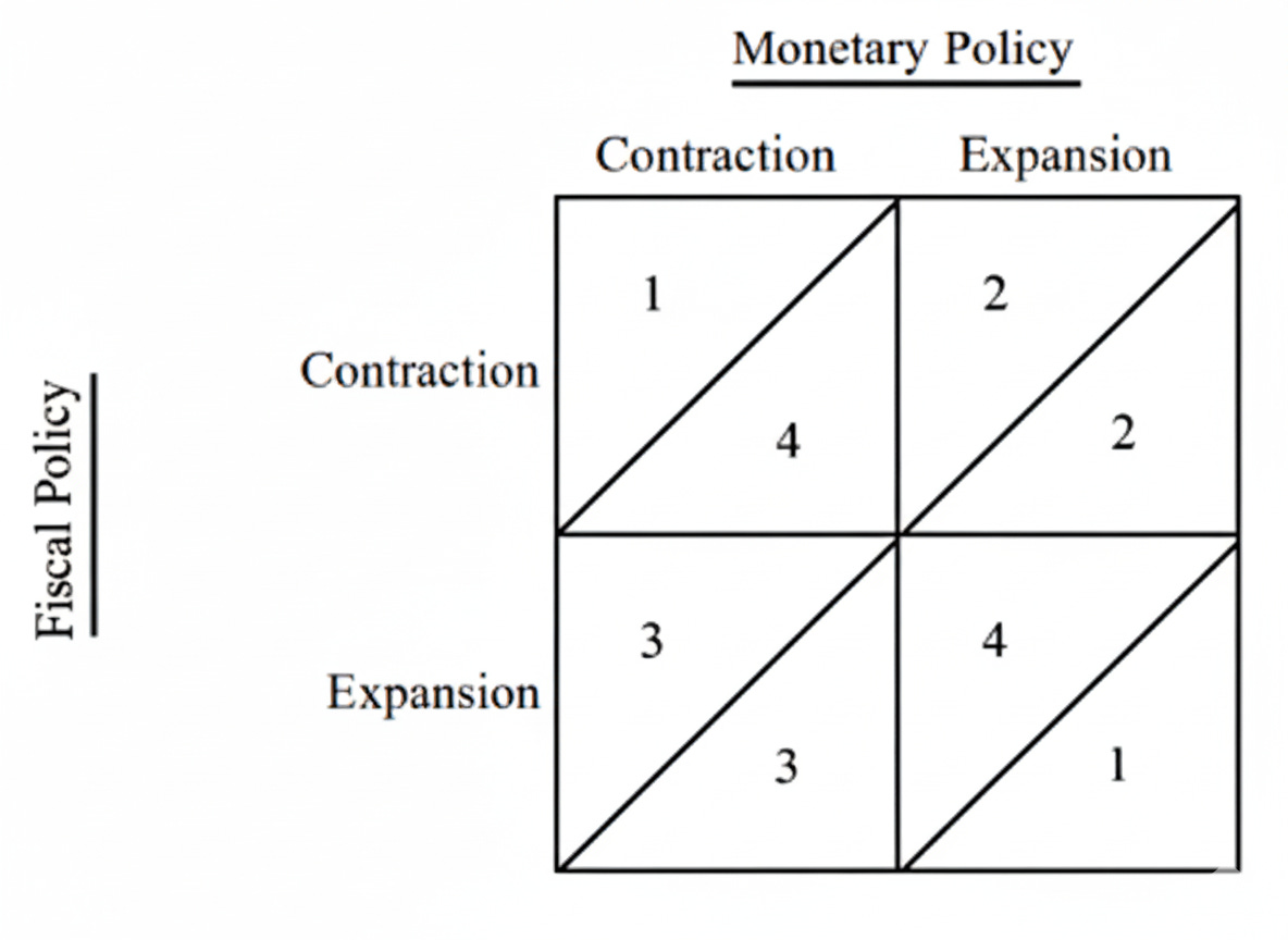 The monetary authority (e.g., the Federal Reserve) is assumed to be "fighting inflation" and thus favors contractionary policies, ranking outcomes opposite to the fiscal authority. This also makes sense as Fed governors and board members have much longer terms and a dual mandate to control inflation and ensure full employment. “Juicing” the economy risks stoking inflation.
