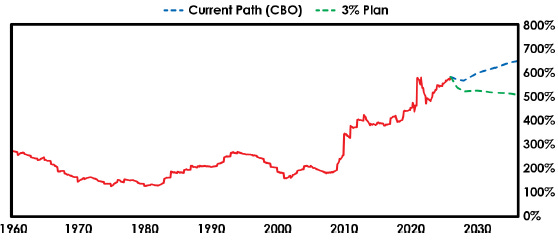 Ray Dalio argues in his 2025 book, How Countries Go Broke, that to stabilize debt and deficits, the authorities should pull all three levers equally to bring the budget deficit down to 3% of GDP. The figure below shows projections of his solution compared with the Congressional Budget Office's (CBO) current estimate.