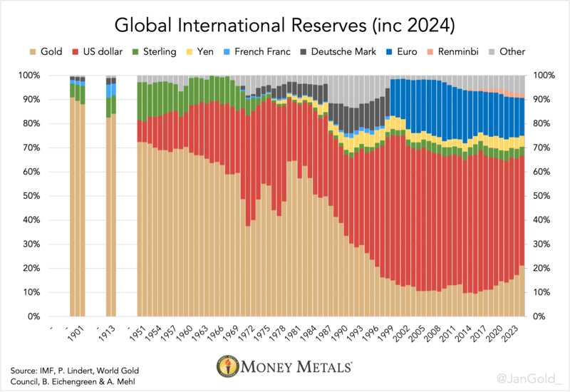 This global fiscal weakness and future monetary inflation are other reasons why I also remain bullish on gold, large multinational stocks, and other stores of value assets. The final chart is one I’ve shared before from Jan Nieuwenhuijs. The brown shaded area shows the percentage of gold held in reserve (savings) in global central bank balance sheets (savings accounts). As fiat currency systems experience monetary inflation (money printing), central banks have been major buyers of gold as a way to backstop sovereign balance sheets. Just as Kilian Jornet builds his fitness pyramid through his deep aerobic base and strong ligaments, gold acts to strengthen a government's balance sheet, providing the stability and confidence in its currency and financial system.