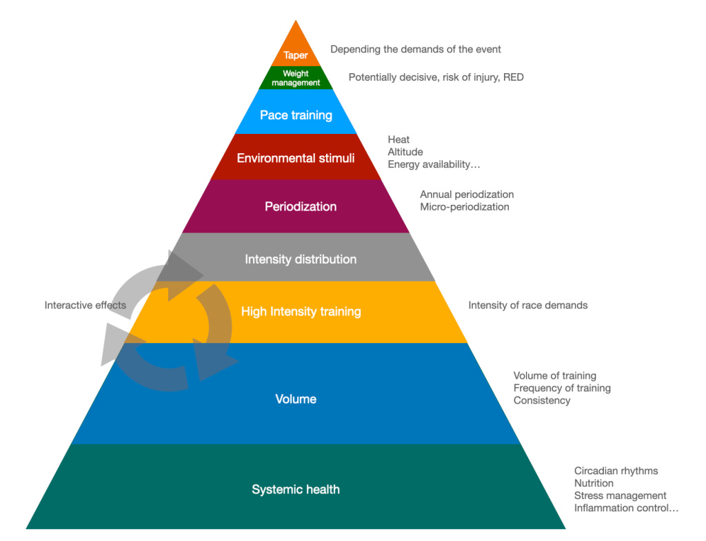 An endurance athlete's key is building “the engine” that allows them to go the distance. This involves years of consistent training. Jornet explains this training by adapting a pyramid of endurance created by Stephen Seiler.