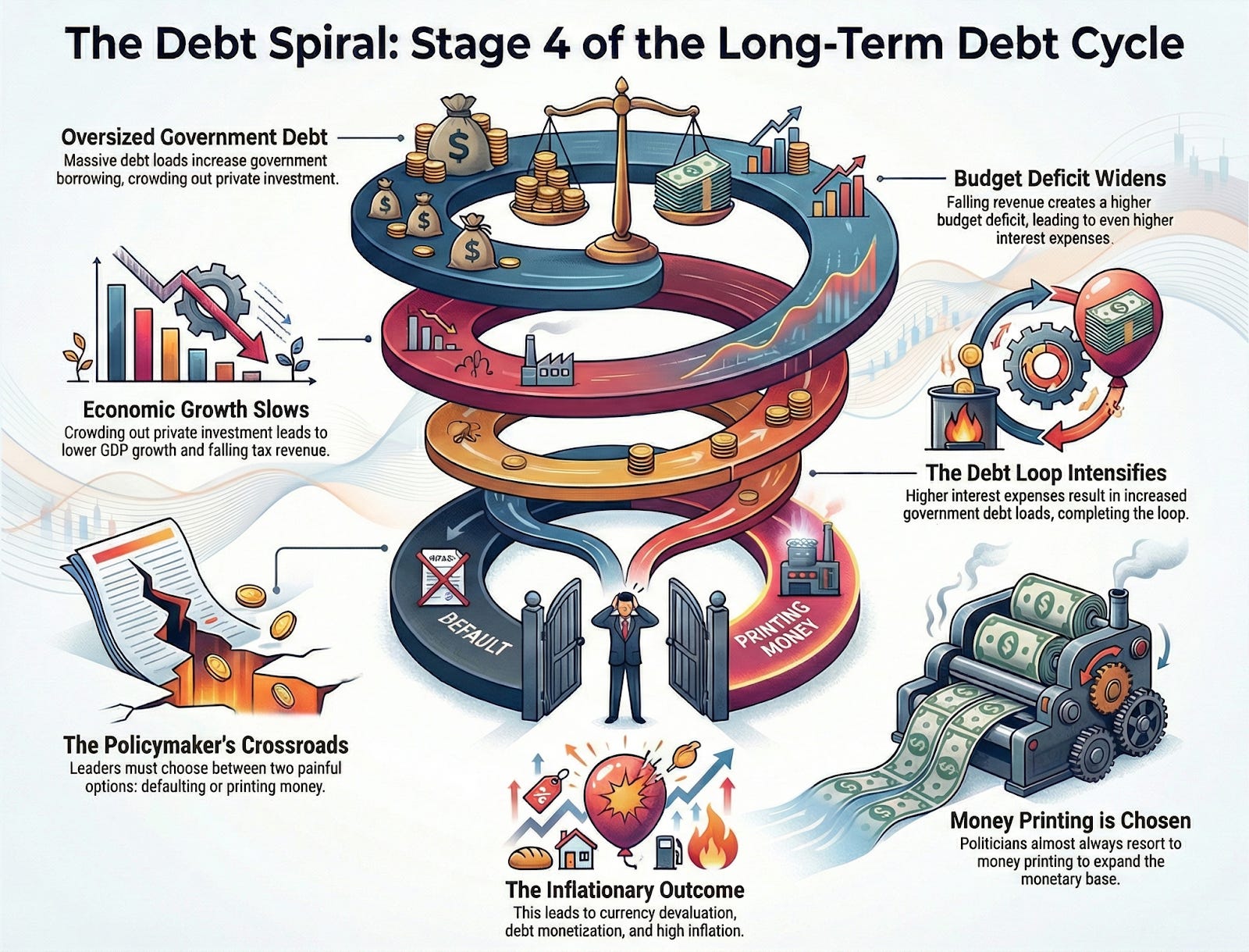 This job sparked my interest in the plumbing of the monetary system. Bank credit creation is quite remarkable, almost akin to alchemy. Credit creation intensifies during the later stages of the long-term debt cycle, as I’ve written about extensively in past articles and in my book Timeless. In brief, the US is nearing the end of the long-term debt cycle, when high government debt puts our economy at risk for a debt spiral. To wit: