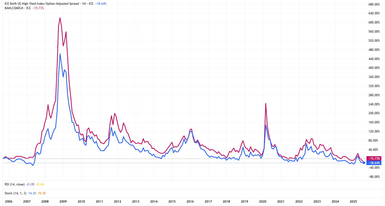 Corporate bond spreads are very “tight,” meaning the interest rate paid to purchase debt issued by a corporation, either high quality or high yield (“junk”), has trended closer to the interest rate you would pay for an equivalent government bond. The closer these converge, markets tend to view this as a signal of economic strength, but it also signals complacency. As seen in Figure 3, these spreads tend to “blow out” and rise in times of credit crises and crunches. See the spikes in 2008 and 2020.