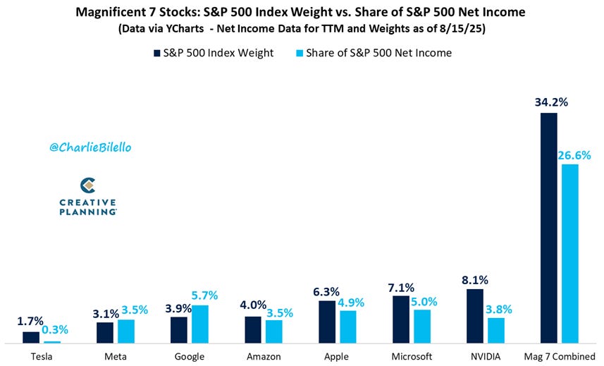 The performance of the S&P 500 has been driven mainly by a handful of stocks known as the “Magnificent 7.” These companies are Microsoft, NVIDIA, Apple, Amazon, Google, Meta, and Tesla. Their weight in the S&P 500 is 34% and the share of net income is 27% (see Figure 1). These are all incredibly profitable and high-quality companies. However, a high concentration of companies makes the market fragile and susceptible to rapid downside moves if the leading stocks falter. The rise of passive investing has also aided and encouraged concentration in stocks.