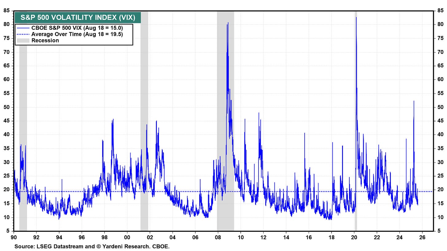 Two measures of volatility are at extremely low levels, suggesting a lack of worry about risk and complacency. The CBOE Volatility Index (VIX) for stocks is hovering around 15, which is below both its 50-day and 200-day moving averages. The VIX spiked to 60 in April of this year. This low volatility is one indication of why many markets have reached or exceeded their all-time highs.