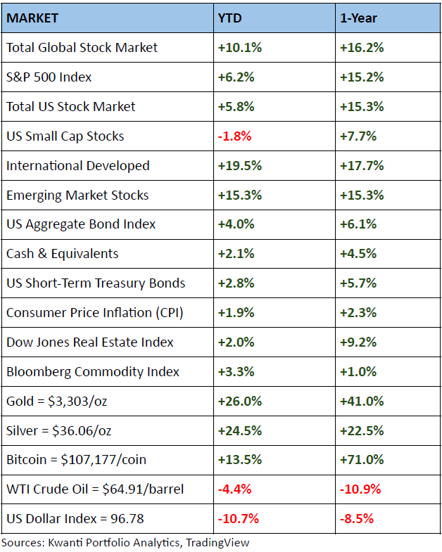 Subsequently, the market staged a robust recovery and rally throughout May and June, with the S&P 500 rebounding to 5,800-5,900. The market hit an all-time high in early July. Many global markets are also near their all-time highs. The valuation gap between US and non-US stocks, along with a falling dollar, has aided international stocks in 2025 as they’ve led stock markets so far this year.