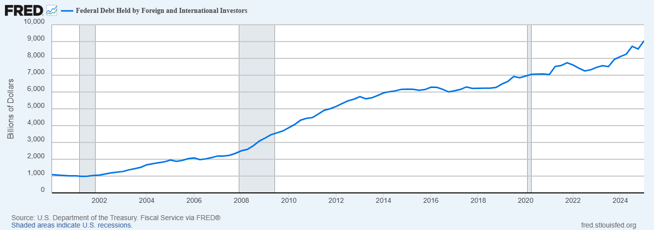 To be clear, the US continues to possess the power of the global reserve currency, and our debt and capital markets remain the most liquid and deep in the world. Even after all the threats over “de-dollarization,” our debt continues to be snapped up by foreign investors, as shown in Figure 1 below. Foreign-held debt exceeds $9 trillion.