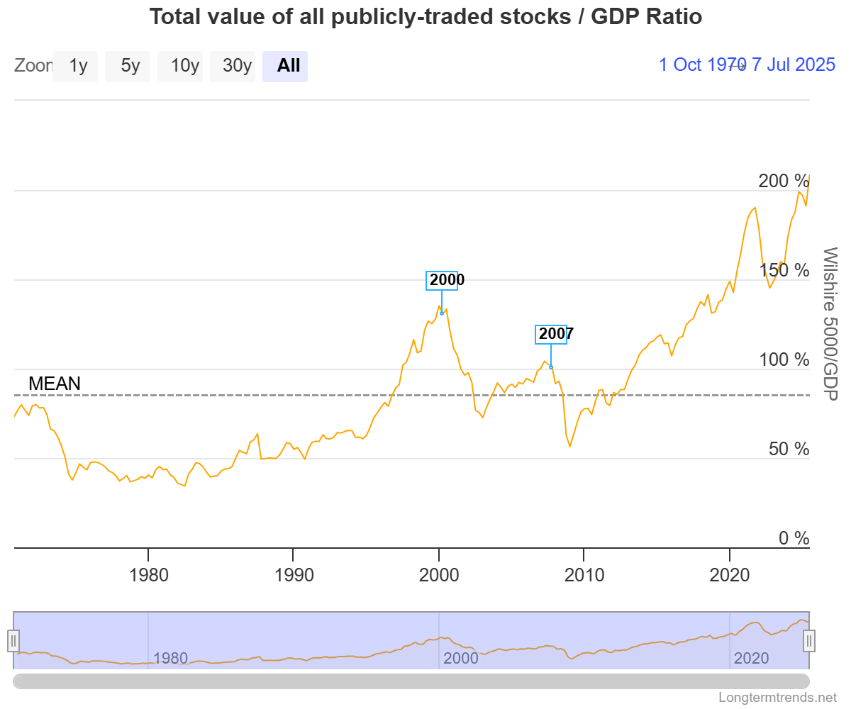 The “Buffett Indicator,” which compares the stock market to the GDP ratio, recently hit an all-time high, as shown below.