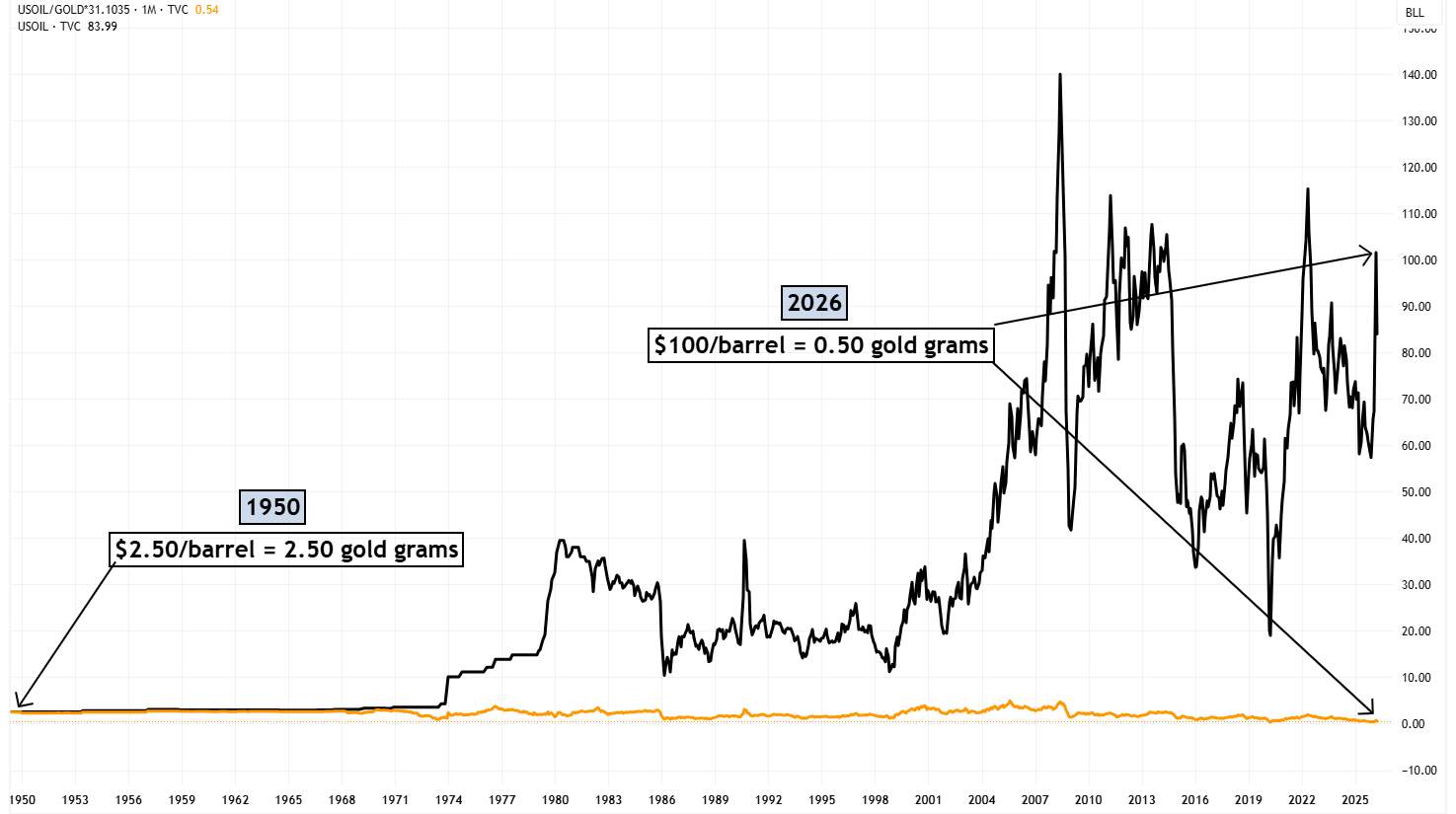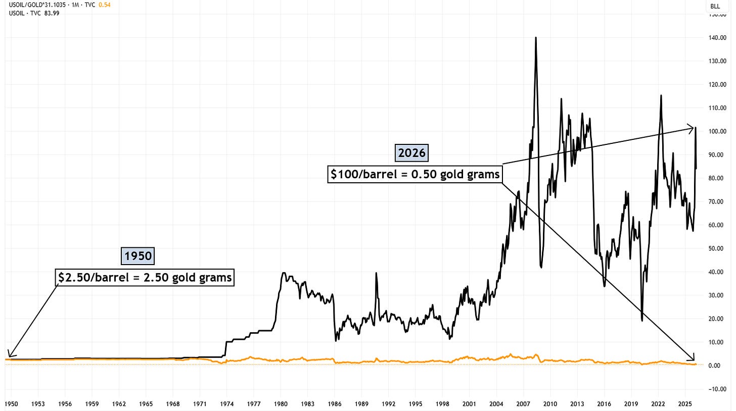The chart below illustrates the cost of one barrel of crude oil from 1950 to 2026, measured in both U.S. dollars and grams of gold.
