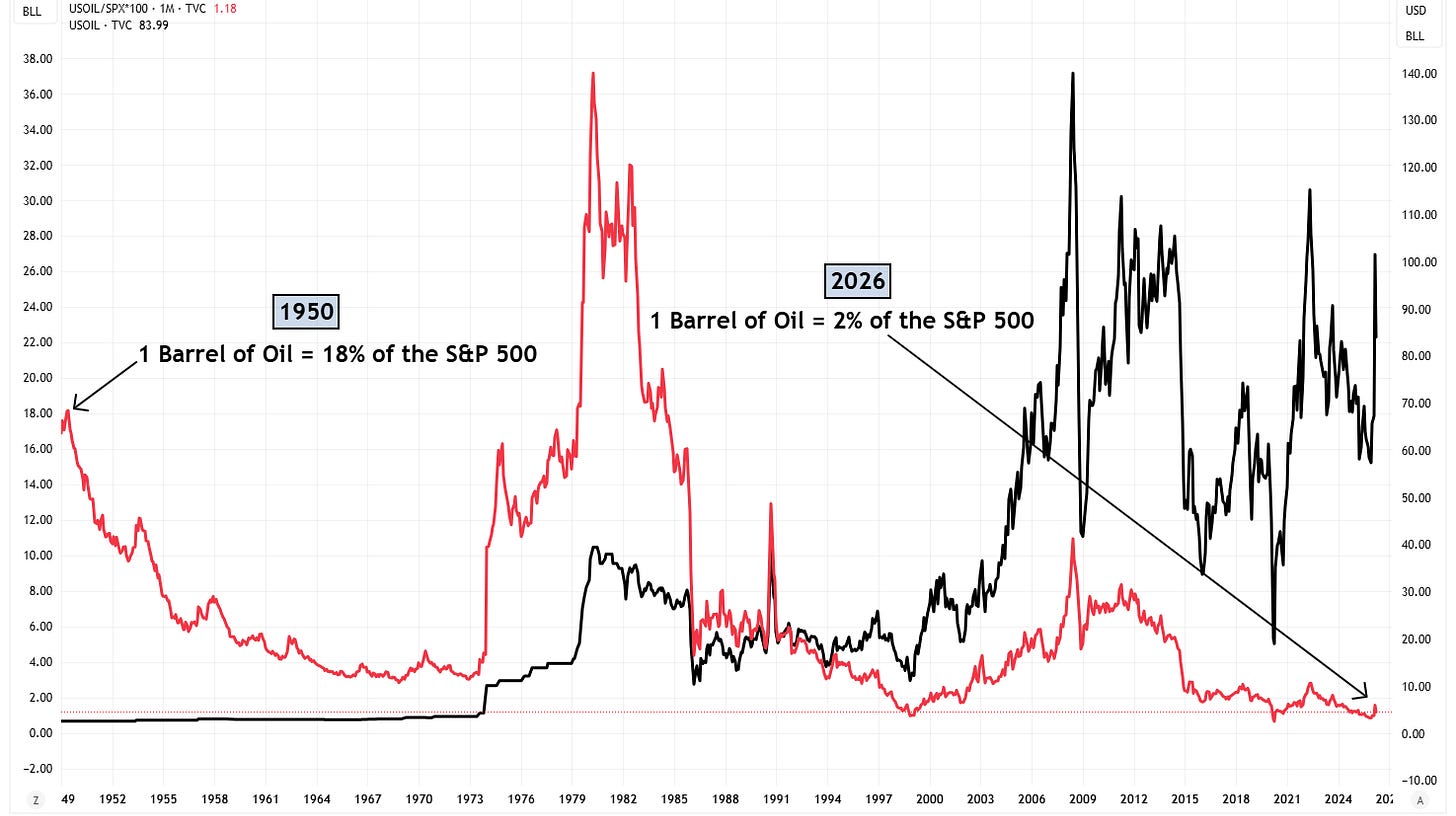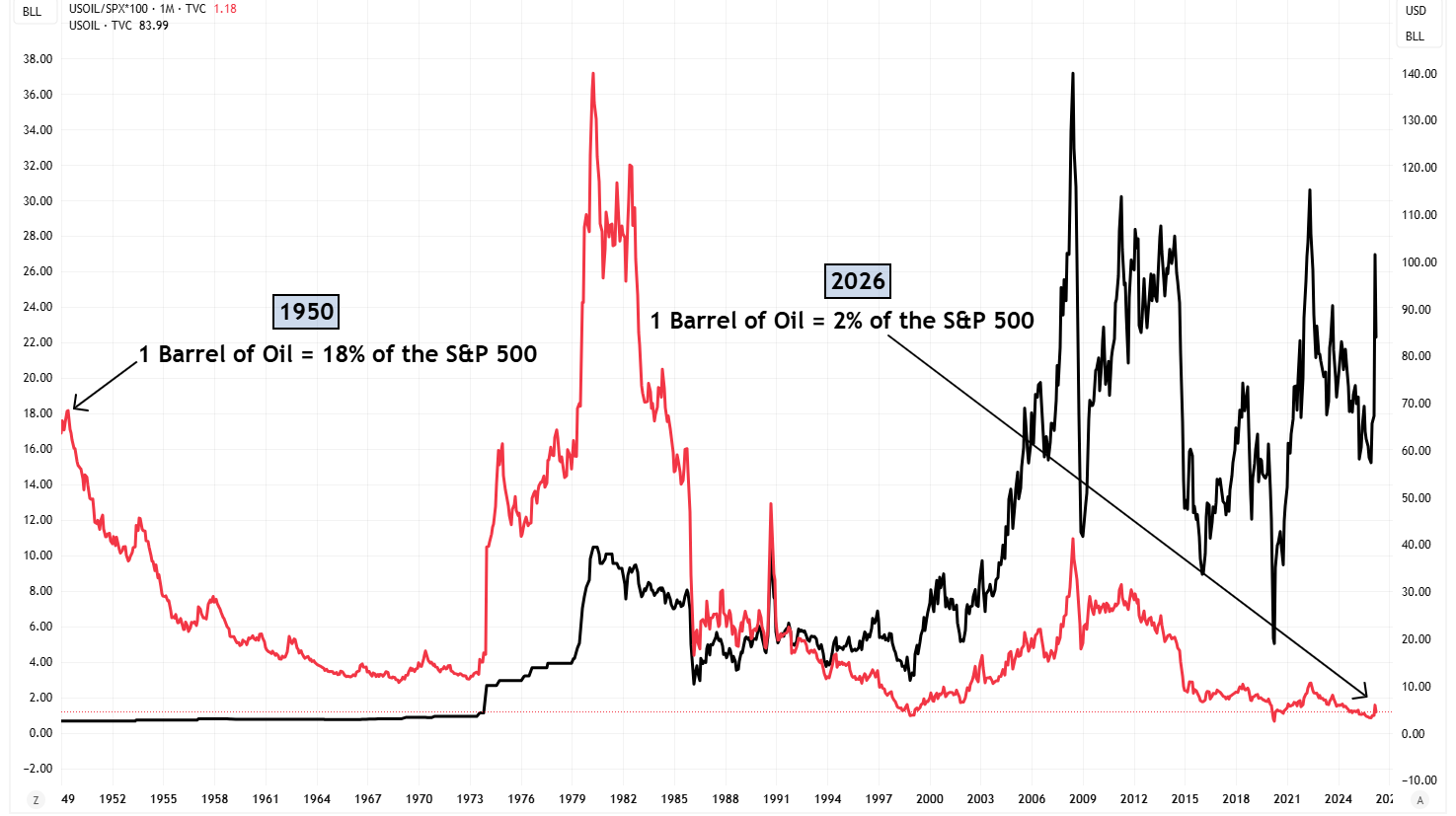 The Red Line (Oil Priced in Stocks): This line tracks the cost of oil in stocks. Think of this line as how many S&P 500 index “units” you would need to exchange for one barrel of oil. In 1950, a single barrel of oil cost roughly 18% of the total price of the S&P 500 index. Today, it costs less than 2%.