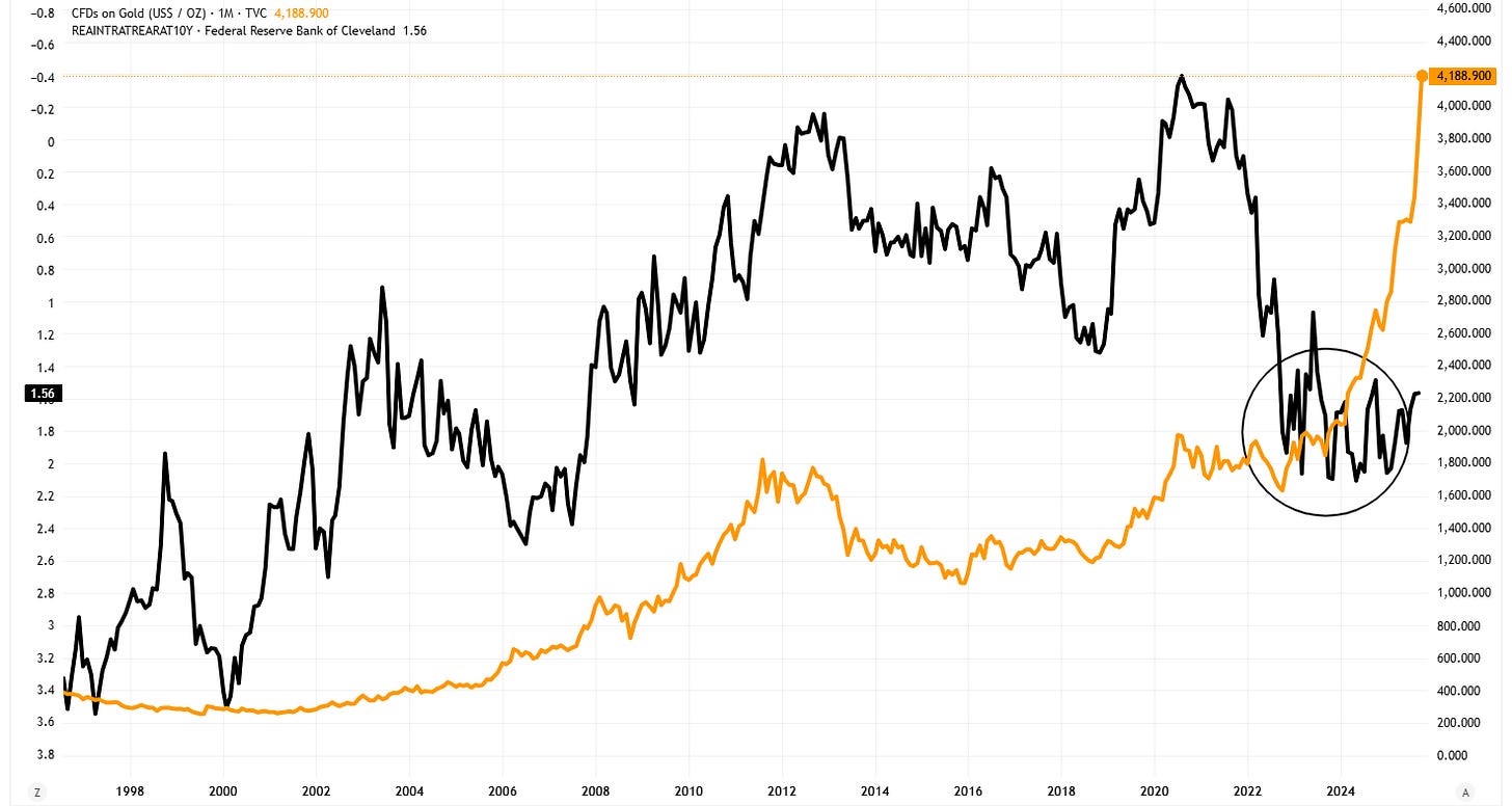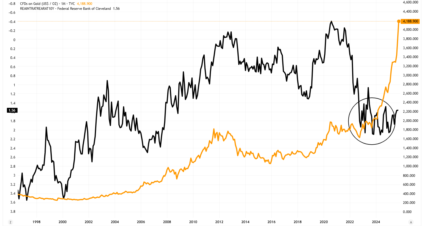 Historically, gold typically rises when real interest rates (nominal rates minus inflation) are low and falling. The reason is that gold provides a better store of value when interest rates are low or negative (the cost of holding gold is lower). Although real rates have recently increased, gold prices have surged anyway, suggesting that the opportunity cost of not holding gold (given debasement fears) far outweighs the loss of interest receipts from holding cash and bonds, especially since late 2022. A visual representation of this is shown in Figure 6 below. This chart plots gold (on the right) alongside the real (after inflation) 10-year US Treasury rate (on the left, inverted, black line). These two were historically correlated (moving higher and lower together). However, the circled area around 2022 marked the divergence, seeing gold rise along with the level of real interest rates.