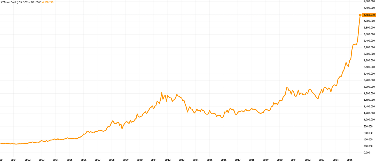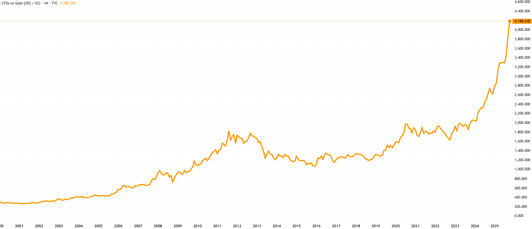 First, let’s discuss performance. Gold has been on an absolute tear of late. In US dollar terms, gold is up almost 60% alone in 2025, rising from around $2,600 to around $4,200 per troy ounce (see Figure 1). Long-term, it’s increased by around 1,400%, a whopping 14x since 2000 (see Figure 2). It’s not always been in a straight line, but it’s been a significant rise since many central banks stopped selling gold bullion around the turn of the century. For sure, momentum has carried the price this year, so a pullback and/or a pause would be natural.