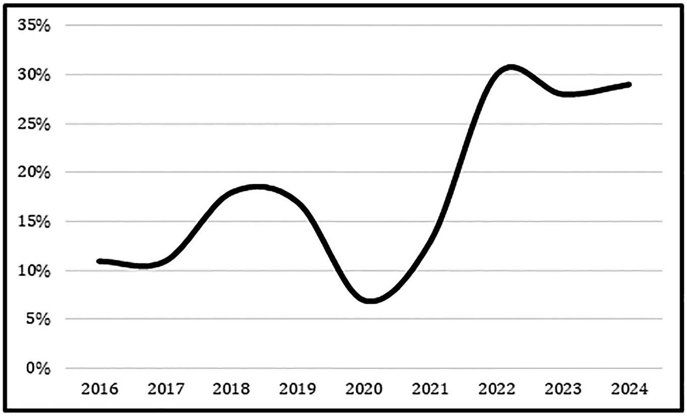 Figure 3: Central Bank Gold Purchases (Percent Yearly Gold Mined), 2016–2024