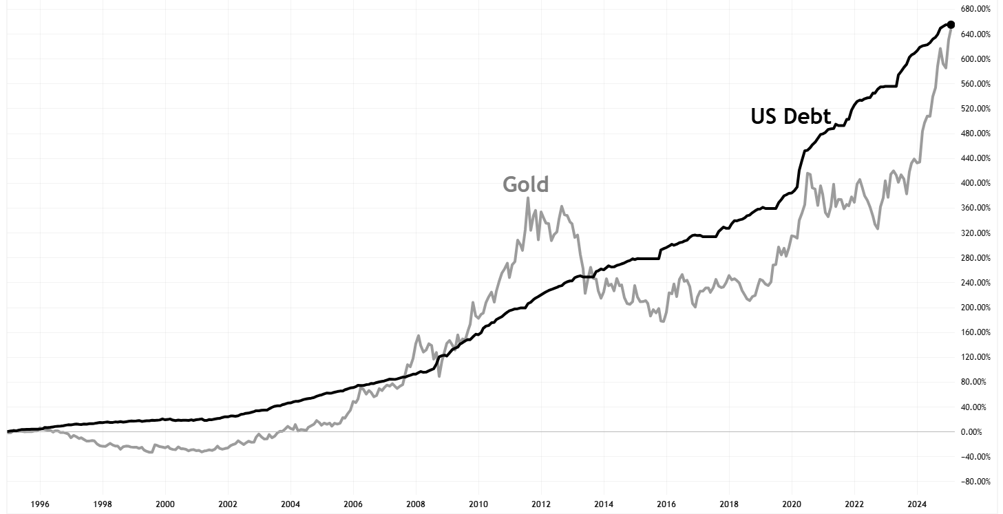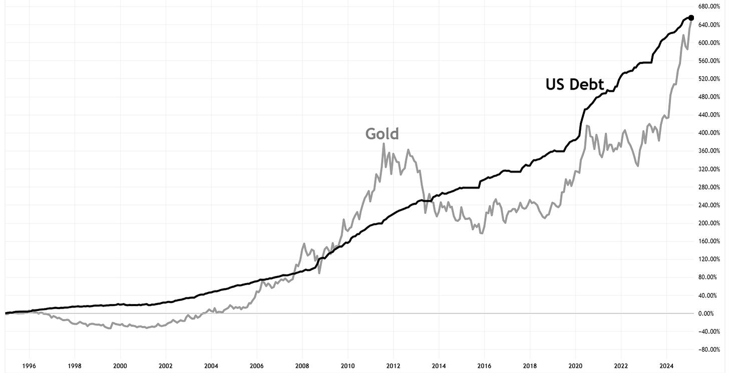 “To prove this point, consider the following figure. The dark line represents the growth of US government debt since 1995. Debt has grown from $4.6 trillion to $36 trillion, a cumulative increase of about 650 percent. The gray line shows the price of gold in US dollars over that same time frame. Gold has increased from roughly $400 to $2,800 per ounce, rising in tandem with the growth of government debt.”3