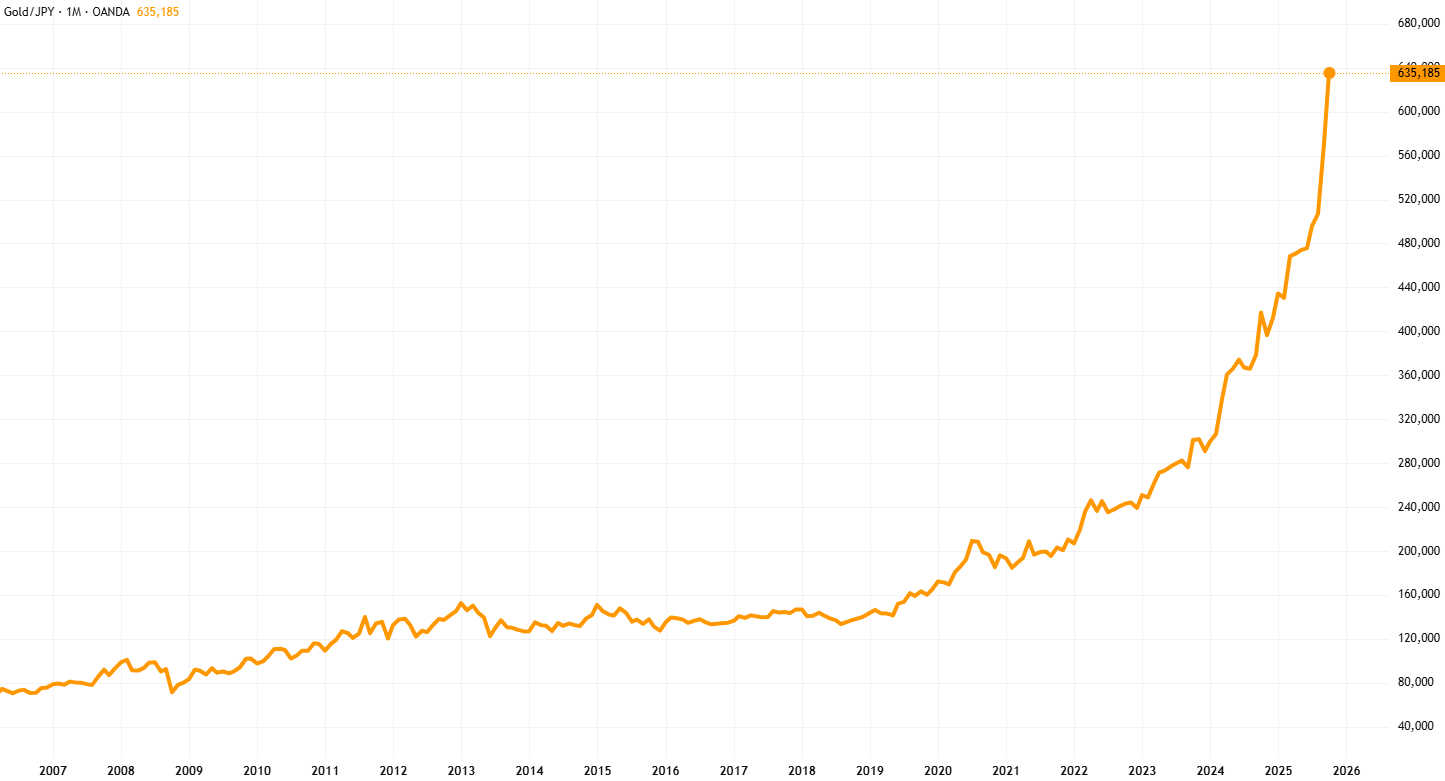Think of it this way. When the price of gold rises (e.g., by 10% in dollars), people often view it as a rise in gold’s price, rather than a fall in the dollar’s value. This distorted perspective, common since the world moved off the gold standard in 1971, obscures the reality that paper money is constantly losing value. Our system is an inflationary system through and through. This is very evident in the Japanese Yen (see Figure 4). An ounce of gold was roughly 70,000 yen in 2006. Today, one ounce of gold is 635,000 yen.
